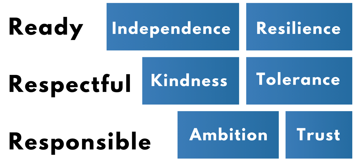 We are committed to developing ready, respectful and responsible learners who can thrive academically, socially and emotionally within an inclusive and ambitious learning environment. We have identified 6 core values which are taught and promoted across all of school life.
